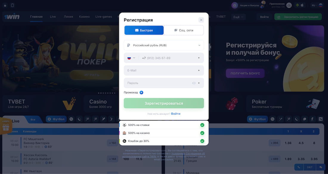 Также предусмотрен вариант «В один клик», который позволяет мгновенно зарегистрироваться и приступить к игре. Этот метод удобен для тех, кто хочет максимально быстро получить доступ к ставкам и казино.